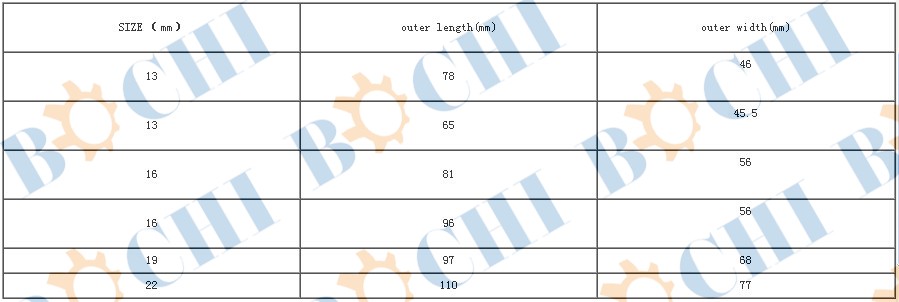 Product Fearures: 1.Size(mm):13,16,19,22,etc. 2.Outside length(mm):65-110 3.Outside width(mm):45.5-77